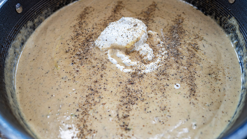 - Deglaze the pan with chicken broth, then add butter, cream of mushroom, and broccoli cheese soup. Stir in heavy cream, sour cream, garlic & herb cream cheese, and garlic pepper. Mix in 1/4 of the shredded cheddar.
