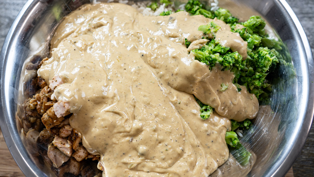 - Pour the sauce over the rice, broccoli, and chicken. Combine everything, then transfer to a baking dish. Top with remaining cheese and bake at 375°F for 25 minutes.