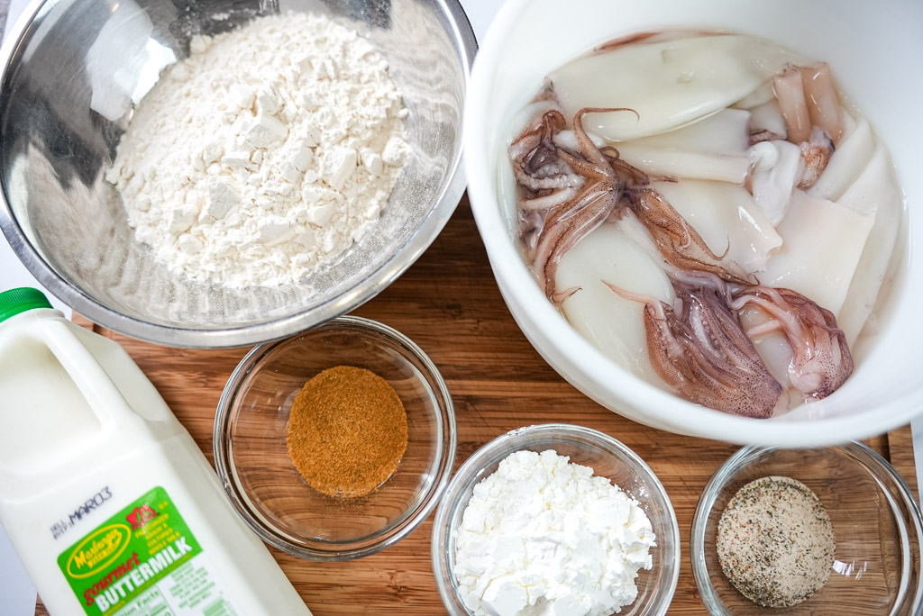 - Buttermilk: Using Buttermilk helps tenderize and break down the squid. resulting in more tender pieces. Also helps the coating and created anaeven coating when fried.