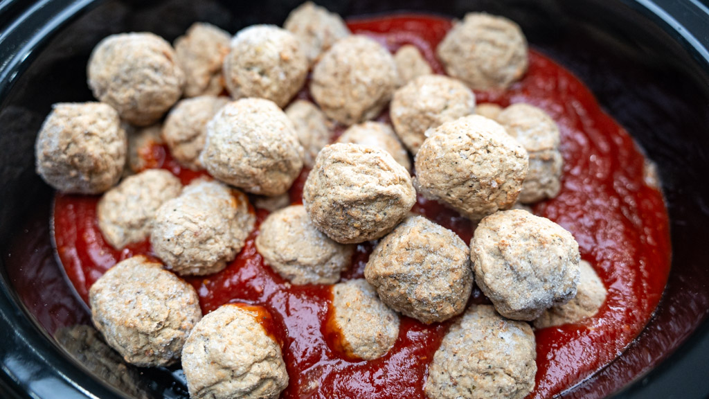 - Add in frozen meatballs, turn crockpot to medium, cover and cook for 4-6 hours.