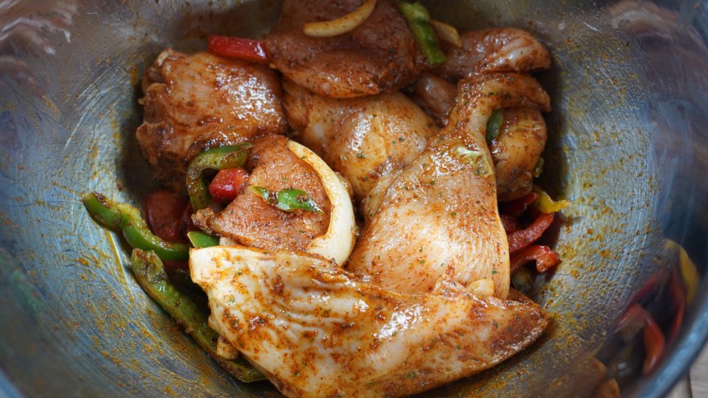- Trim excess fat off chicken breast and butterfly. To a large bowl, add chicken breast and sliced onions and peppers. Drizzle over olive oil and season with chicken taco season and nature seasoning to taste. Thoroughly mix together until fully incorporated.
