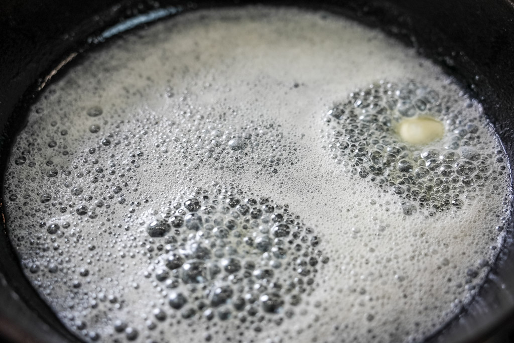 - To a cast iron on low heat add in drizzle of cooking oil and 1tbsp butter.