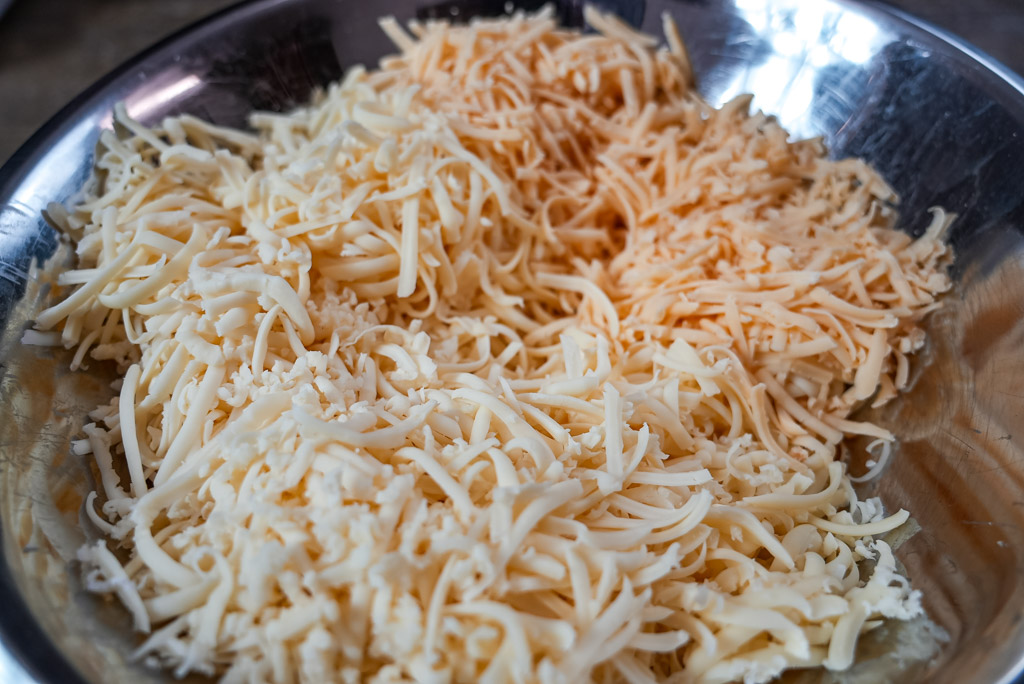 - Grate cheeses into a bowl and mix to create a three-cheese blend.