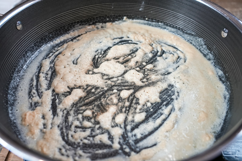 - In a large pot over medium-high heat, melt the butter. Once fully melted, sprinkle in the flour and whisk continuously until a smooth roux forms.