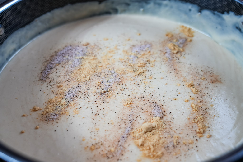 - Sprinkle in half of the cheese blend, whisk until melted. Season with Nature’s Seasoning and ground mustard, mixing well.